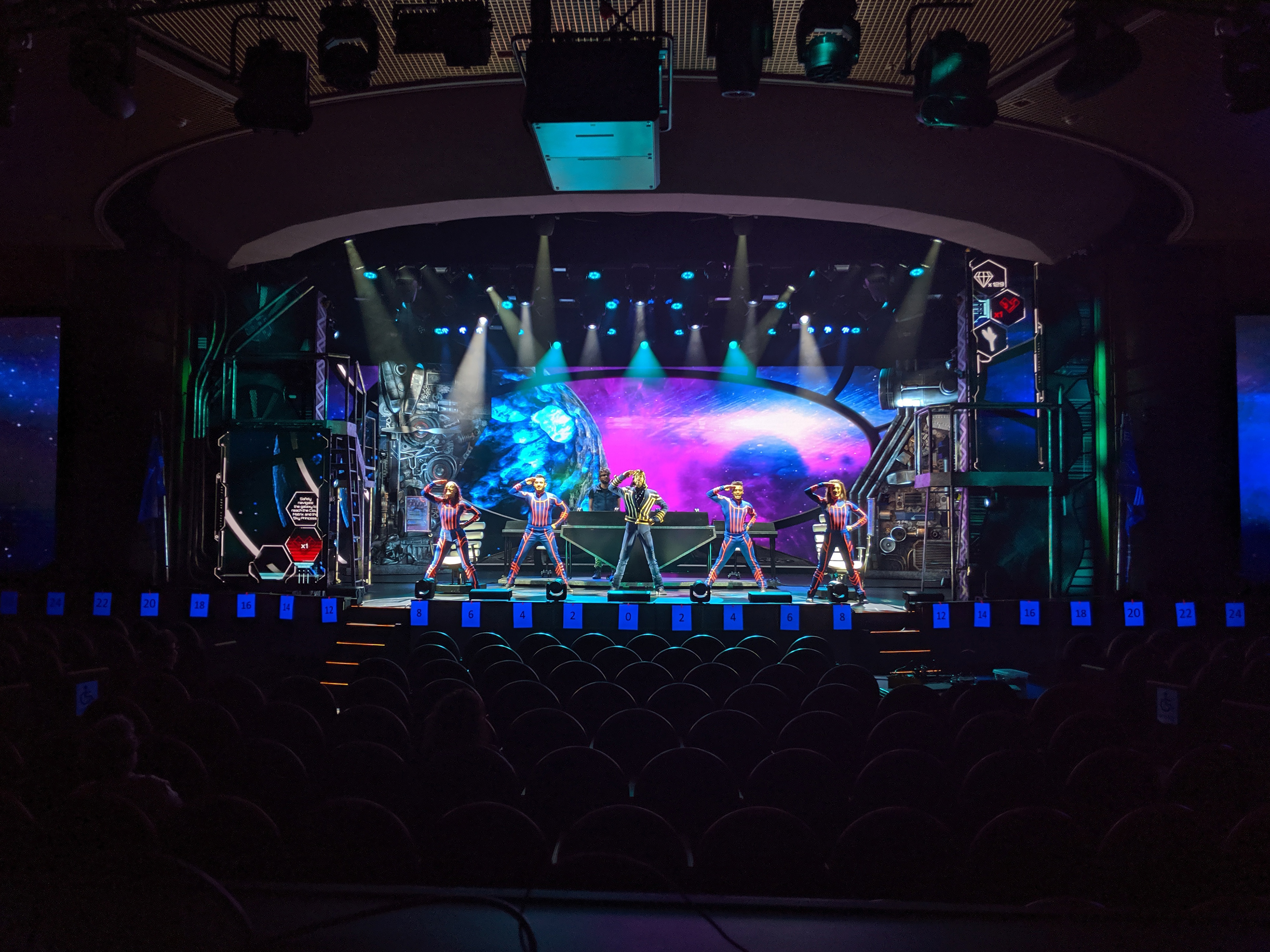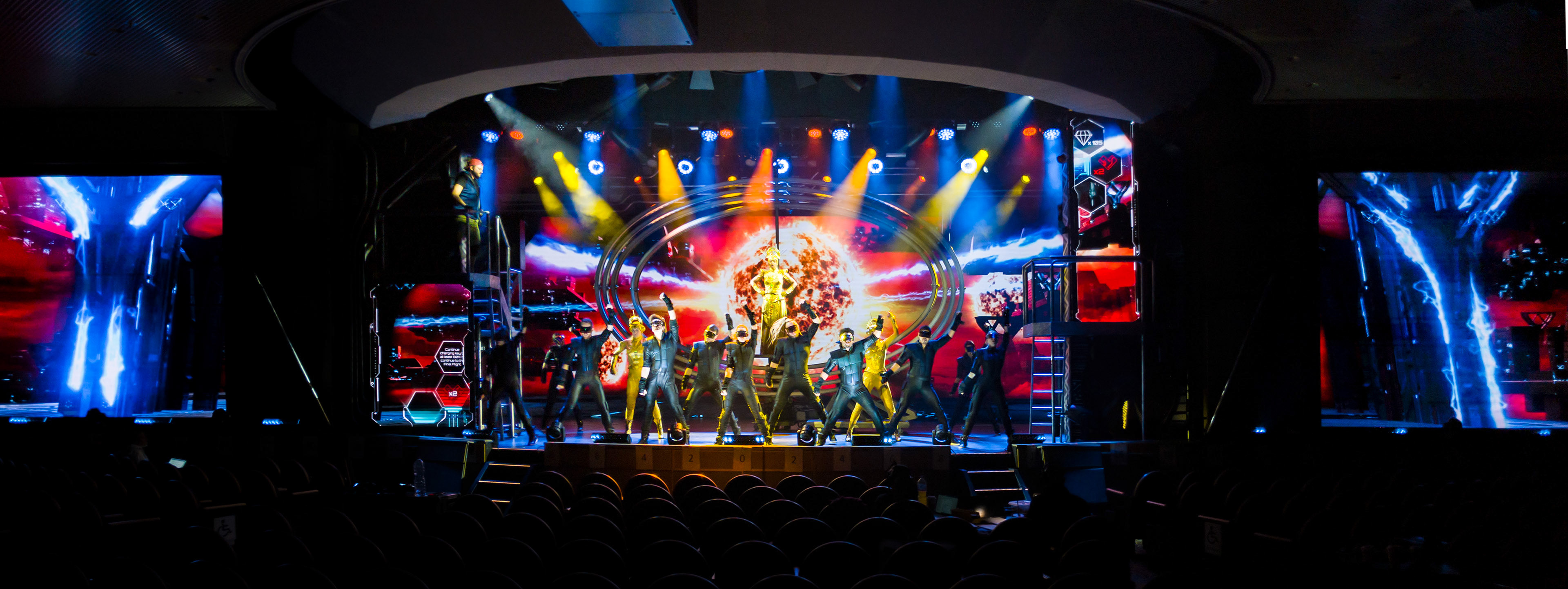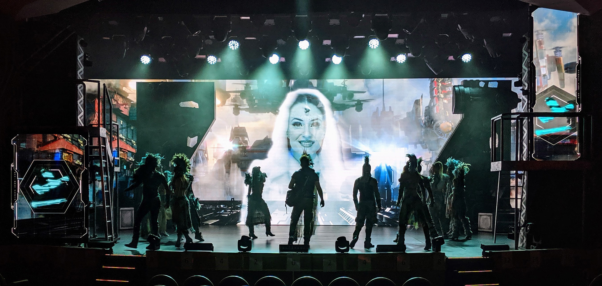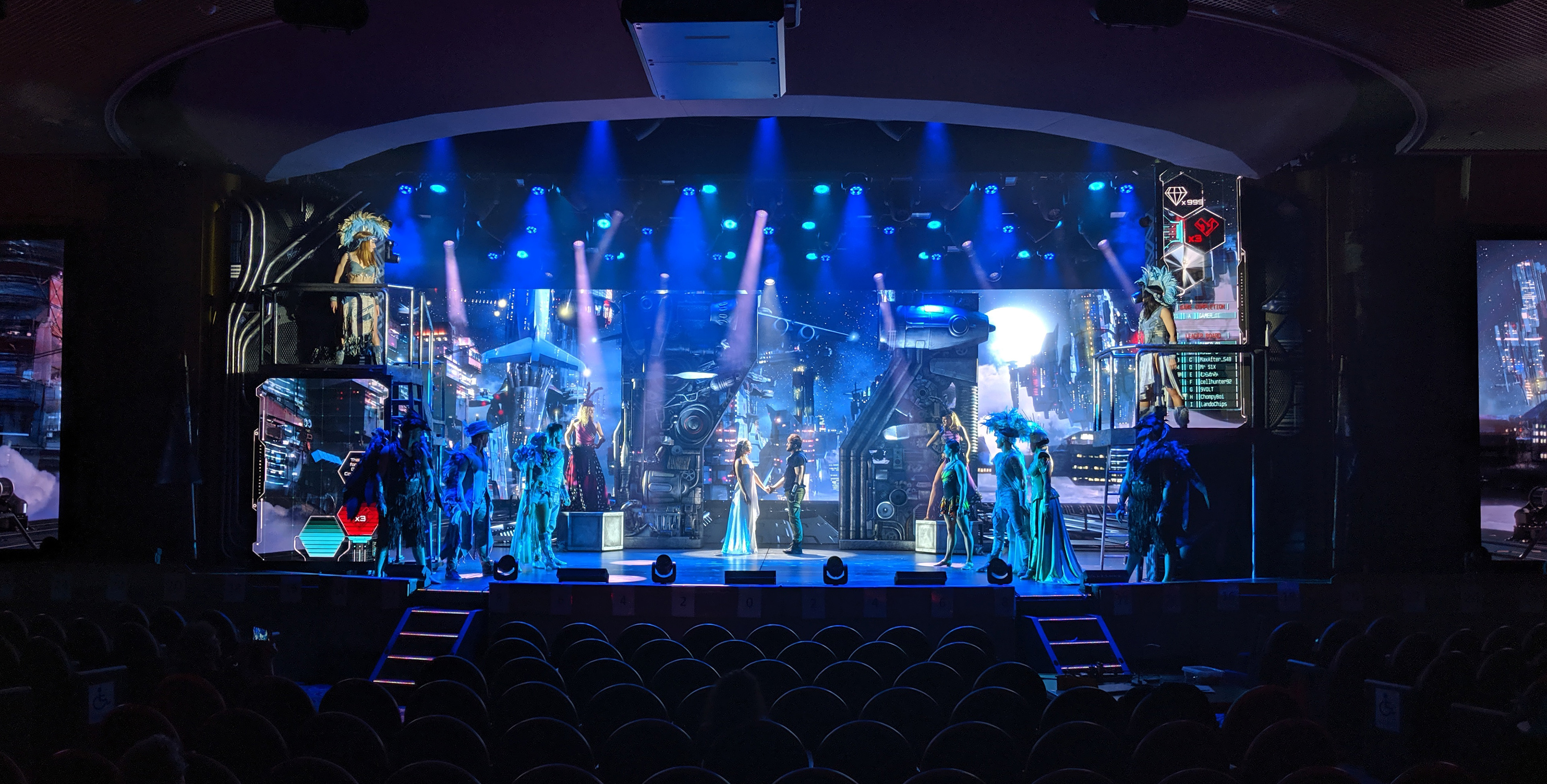 An epic sci-fi musical revue aboard the flagship of Princess Cruises, 5-Skies (stylized 5-SK1-E-5) represents just under a year's worth of work, collaborating with visual and digital artists across disciplines of 3D Modeling, Matte Painting, Illustration, and Traditional Animation. Combining immersive darknet hologram projections with a proscenium-breaking panorama of video walls, all rehearsed and integrated with aerial performances while at sea, this production serves as a capstone to my first decade as a designer.