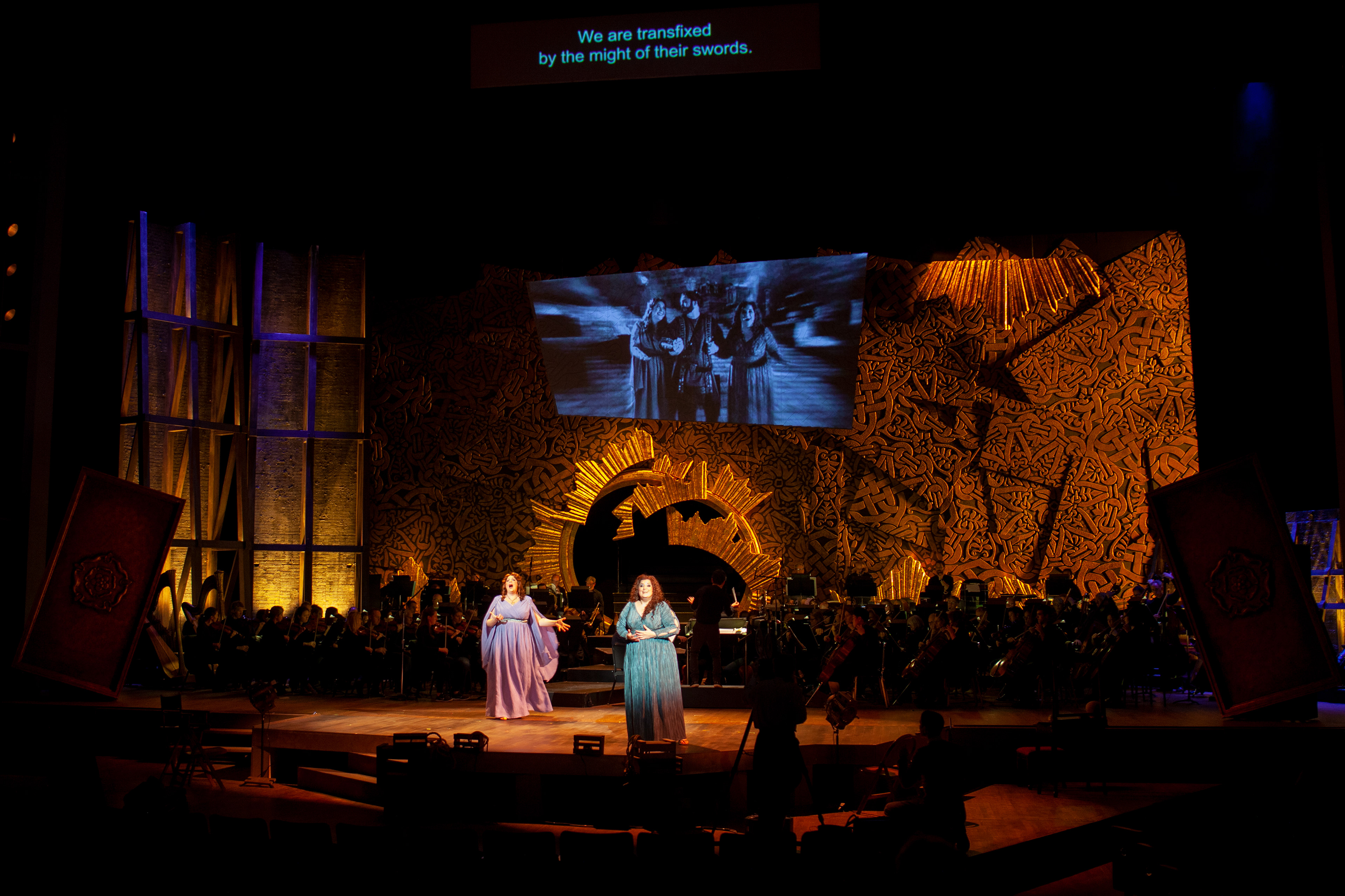 Additionally, an entire film with matching aesthetic was created for the preshow to provide context for the Opera, including the sacrifice of Iphigenia by Agamemnon and revenge of Klytemnestra.